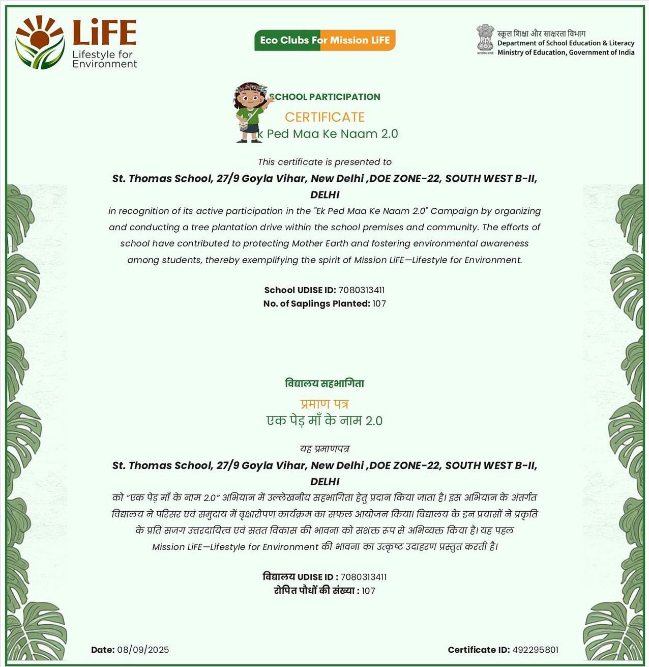 We are delighted to share that St. Thomas School, Dwarka has been awarded a Certificate of Participation in the “Ek Ped Maa Ke Naam 2.0” campaign by the Department of School Education & Literacy, Ministry of Education, Government of India.
