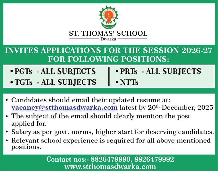 - Email Submission: Candidates can apply by sending their updated resume to: vacancy@stthomasdwarka.com